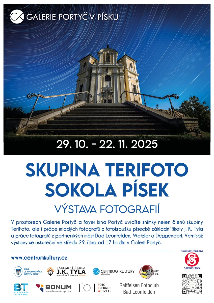 Skupina TeriFoto Sokola Písek vás zve na výstavu fotografií která se bude konat od 29.října do 22.listopadu 2025 v Galerii Portyč a ve foyer Kina Portyč v Čechově ulici v Písku.